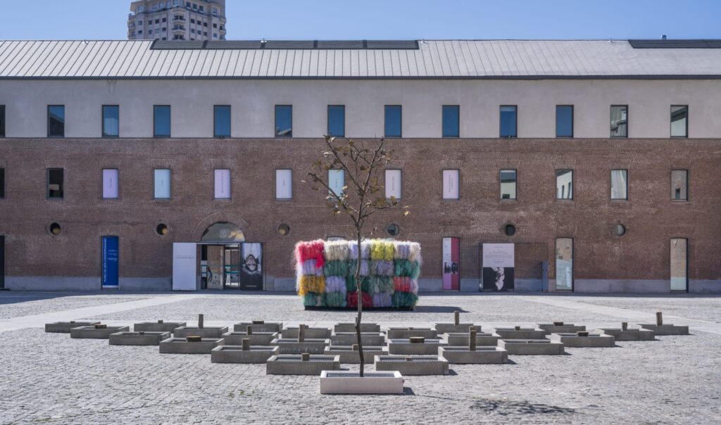 Línea rota de horizonte de Carlos Garaioca. (Centro Condeduque de Madrid). Esta obra comisariada por David Barro establece un diálogo con las estructuras de la ciudad y su relación con la  naturaleza, en muchos casos maltratada y descuidada o, como en este caso, mutilada.