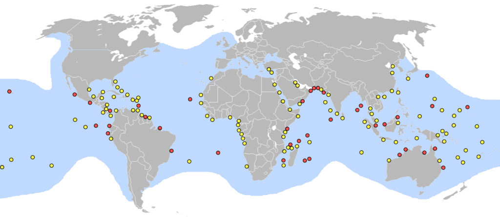 Mapa de anidación de la tortuga laúd. En Rojo marcados los puntos principales de puesta. Fuente wikipedia