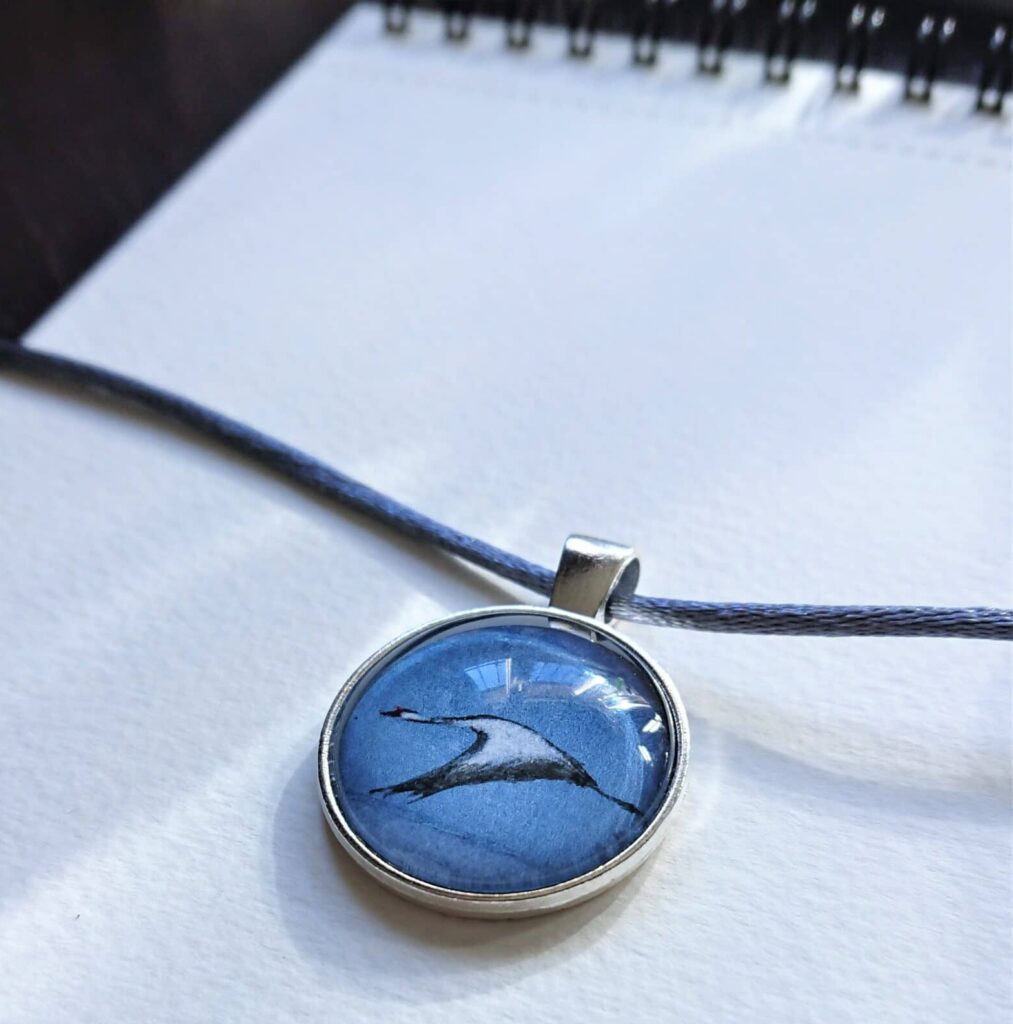 Anna Astrom y su  Amuleto “Guía de la Vida”. Anna es una artista genial que he descubierto recientemente y a la cual admiro sinceramente. Todo lo que hace Anna está basado en el profundo amor hacia la naturaleza. Sus amuletos llevan una miniatura original de acuarela – pintada respetando la acuarela clásica donde el agua es el único blanco y el agua la luz – con motivo de paisaje o animal salvaje que nos ilustran el camino a seguir por el bien de nuestro futuro y el de las grullas y el de los bosques y los mares,… por el futuro de este planeta y por la vida! Yo encargué el mío es muy personal y Anna se ha volcado desde que compartí mi idea. El resultado excede con mucho lo que esperaba, lo llevo con orgullo, es mi ¨lifeguide Amulet” y me protege.